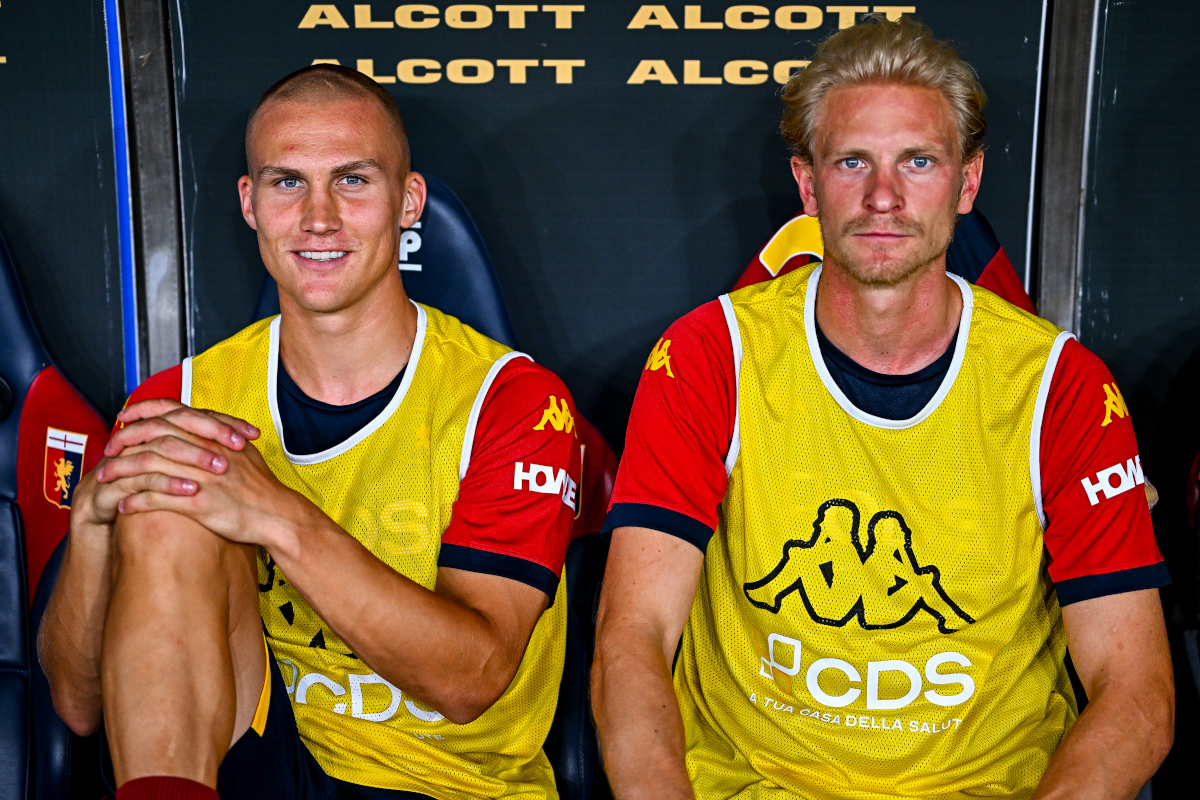GENOA, ITALY - AUGUST 15: Leo Ostigard (left) and Morten Thorsby of Genoa sit on the bench prior to kick-off in the Coppa Italia match between Genoa CFC and LR Vicenza at Stadio Luigi Ferraris on August 15, 2025 in Genoa, Italy. (Photo by Simone Arveda/Getty Images)